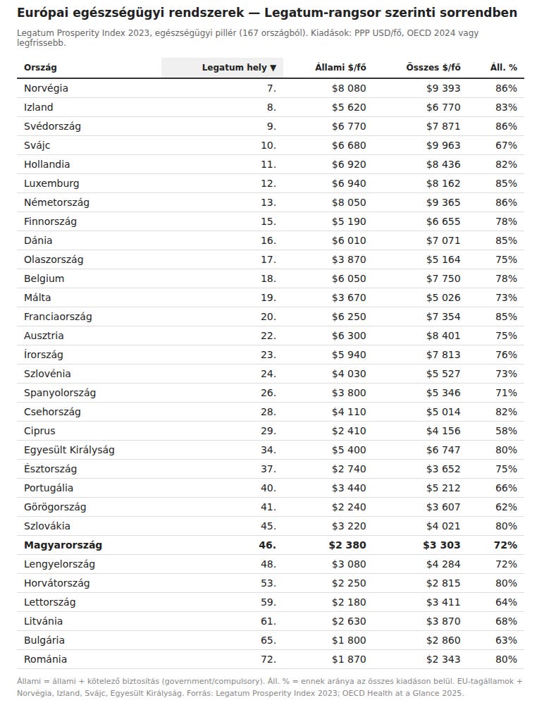 Éppen ezért mi egy nem kifejezetten egészségüggyel foglalkozó, hanem egy általános jólétet mérő index, a Legatum Prosperity Index egészségügyi részének rangsorát vettük alapul. A táblázatban minden európai ország esetén szerepel a világrangsor szerinti hely, az egy főre jutó, GDP-paritáson számolt állami forrásból fedezett, továbbá az összes egészségügyi költés, valamint az állami költés aránya az összesen belül (ezek az értékek az OECD 2024-es adatai alapján kerültek a táblázatba).