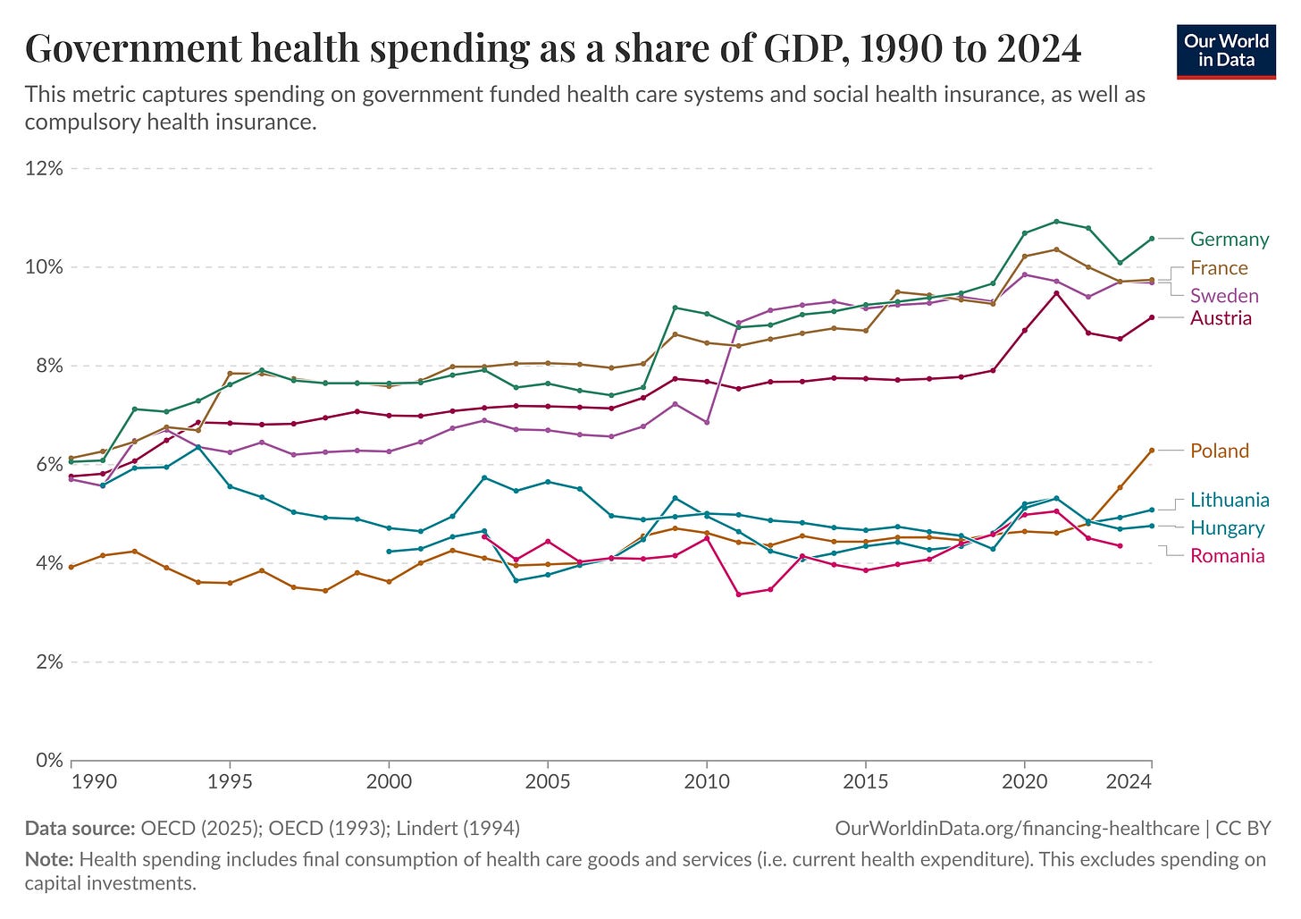 Ráadásul itt nem egyetlen év alacsonyabb kiadásáról van szó. Az alábbi ábra 1990 óta mutatja egyes országok költségvetésének egészségügyi kiadását. 2010-ig nem egyedi magyar jelenségről van szó. A nyugat-európai országok, amelyek eleve többet költöttek a kormányzati forrásokból egészségügyre, az utóbbi évtizedekben még növelték is ezeket az összegeket. Ezzel szemben a kelet-közép-európai országok egyre-másra vágták meg ezeket a forrásokat. A magyar egészségügy kálváriája nem 2010-ben kezdődött – de onnantól nem volt megállás.